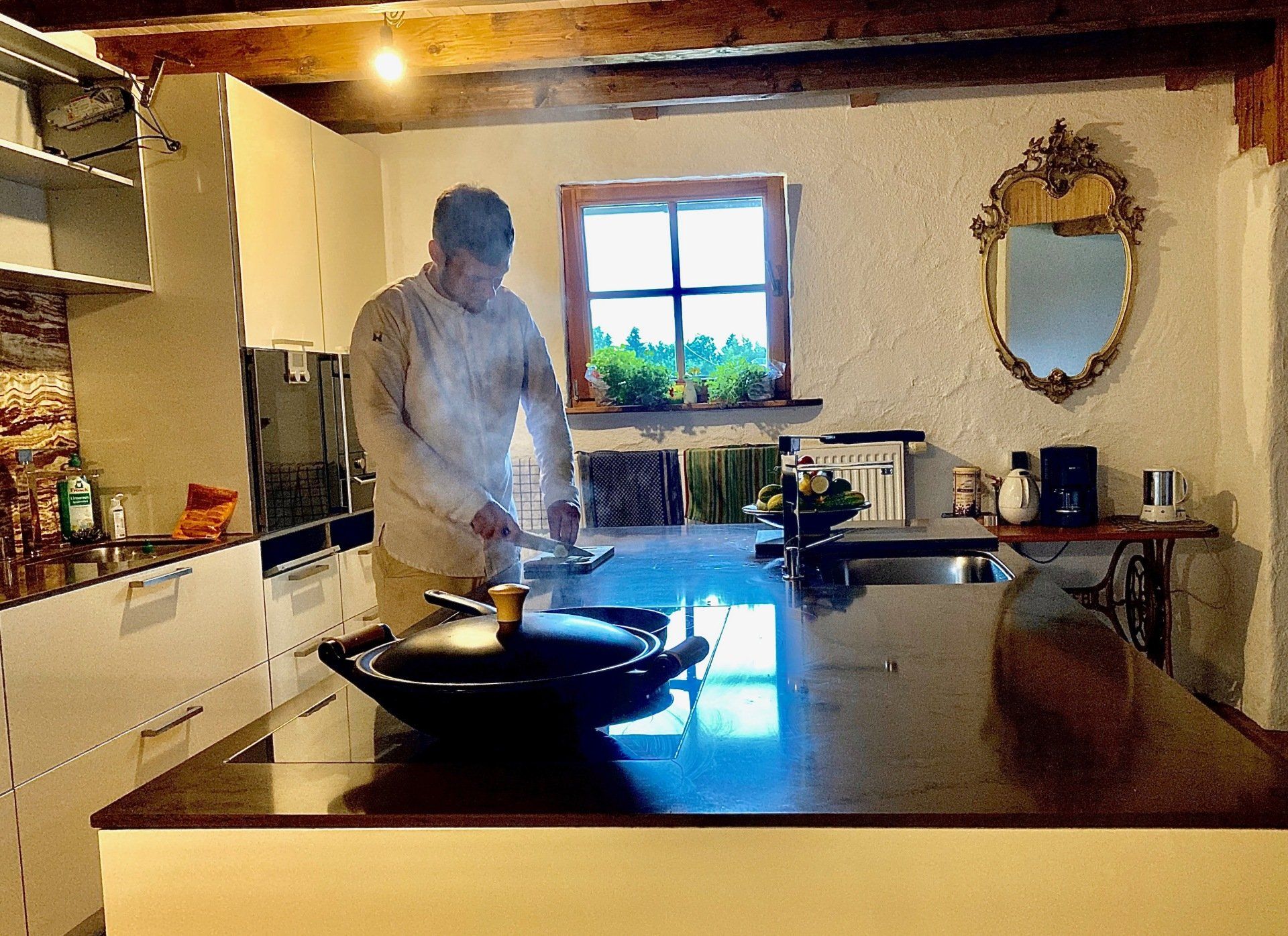 In unserer hochwertigen Küche, ausgestattet mit Gaggenau Geräten, fehlt es an nichts. Zur Ausstattung gehören ein großer Kühlschrank, Gefrierschrank, Mikrowelle, Dampfgarer, 2 Backöfen und ein Induktionsherd. Kaffeemaschine, Wasserkocher, Toaster, Geschirr, Gläser, Besteck, Töpfe, Pfannen etc. sind ebenfalls vorhanden.